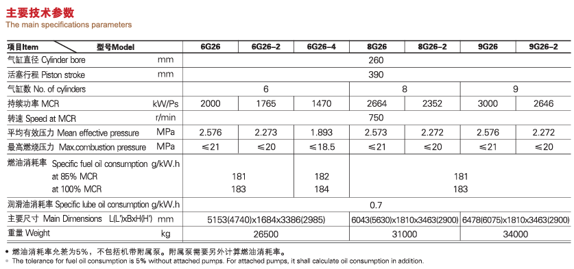 The series G26 diesel engine is a self - developed new product, and it is developed successfully based on much calculation for a long time, test data and abundant manufacture experience, also absorbed the advanced technique from international brand engines, can use 380cSt/50P HFO, the crankshaft adopts full balanced construction so the whole engine vibration is small, and the engine can be output of 100% rated power from free end. The engine operation is reliability with high economy, and meets environmental regulations. Making clients satisfied is our untiring pursuit.